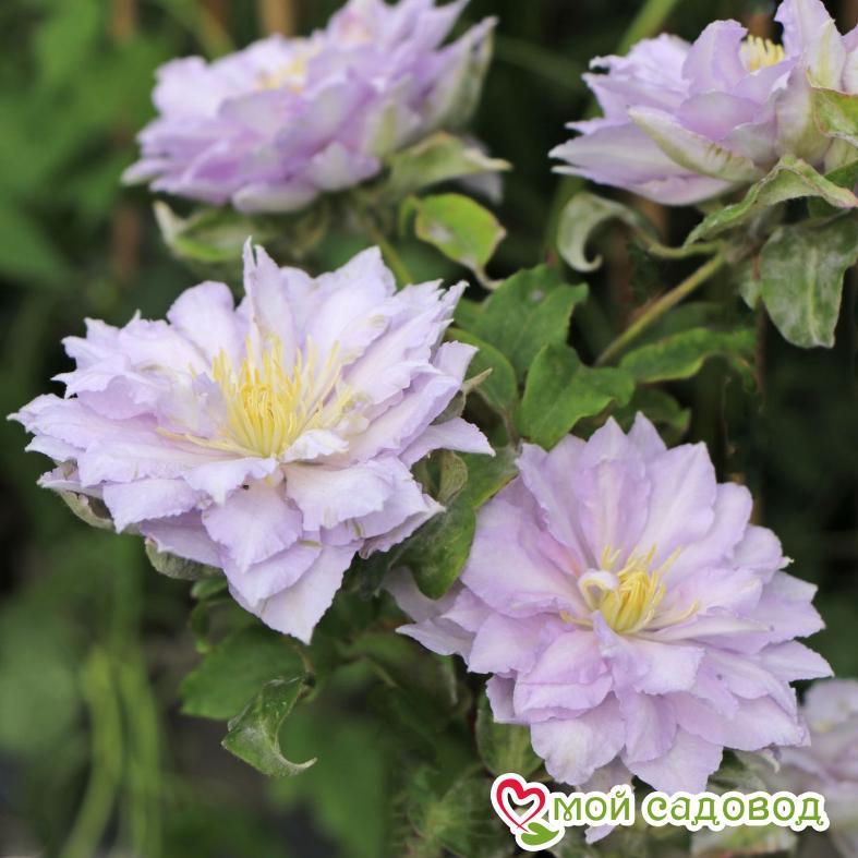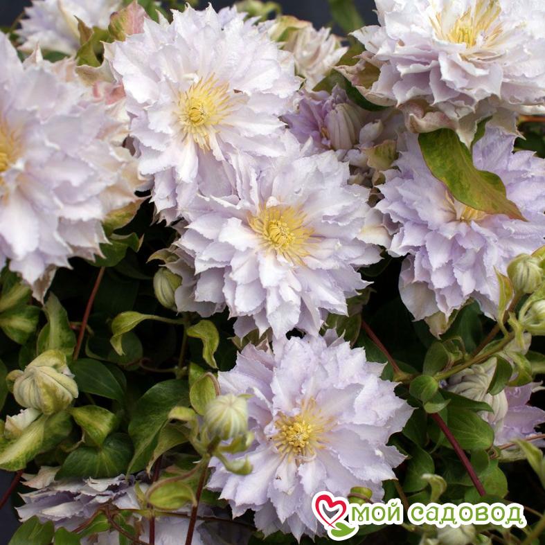 Клематис ‘Дансин Кинг’ — крупноцветковый раннецветущий сорт. Цветки всегда махровые, шаровидной формы, нежно-сиреневые, позже приобретают более раскрытую махровую форму и меняет цвет на бледно фиолетовый. Тычинки желтые. Диаметр цветка от 5 до 12 см. Цветет на побегах прошлого года махровыми цветками с мая по конец июня, повторное цветение на побегах этого года махровыми цветками с июля по сентябрь. Хорошо растет на солнечных и защищённых от ветра местах. Вполне устойчив к садовым вредителям и болезням. Особенно хорош для выращивания у ограждений, беседок, пергол, решёток. Прекрасно подходит для выращивания в больших контейнерах на террасах и балконах. В нашем интернет-магазине вы сможете купить Клематис Так же возможно вас заинтересуют Клематис Дансинг квин и Клематис Дансинг Смайл .